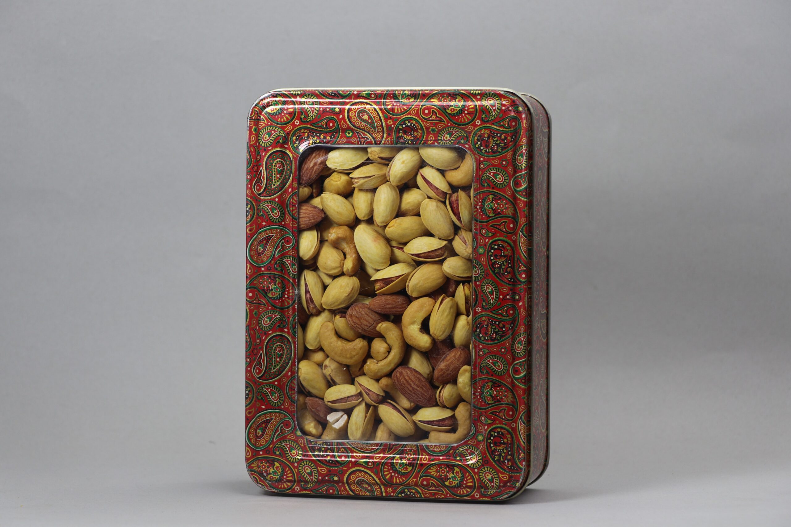 بسته‌بندی فلزی نفیس: جعبه فلزی مقاوم و زیبا که علاوه بر حفظ تازگی و کیفیت آجیل، جلوه‌ای لوکس و چشم‌نواز به آن می‌بخشد و آن را مناسب هدیه دادن می‌کند.